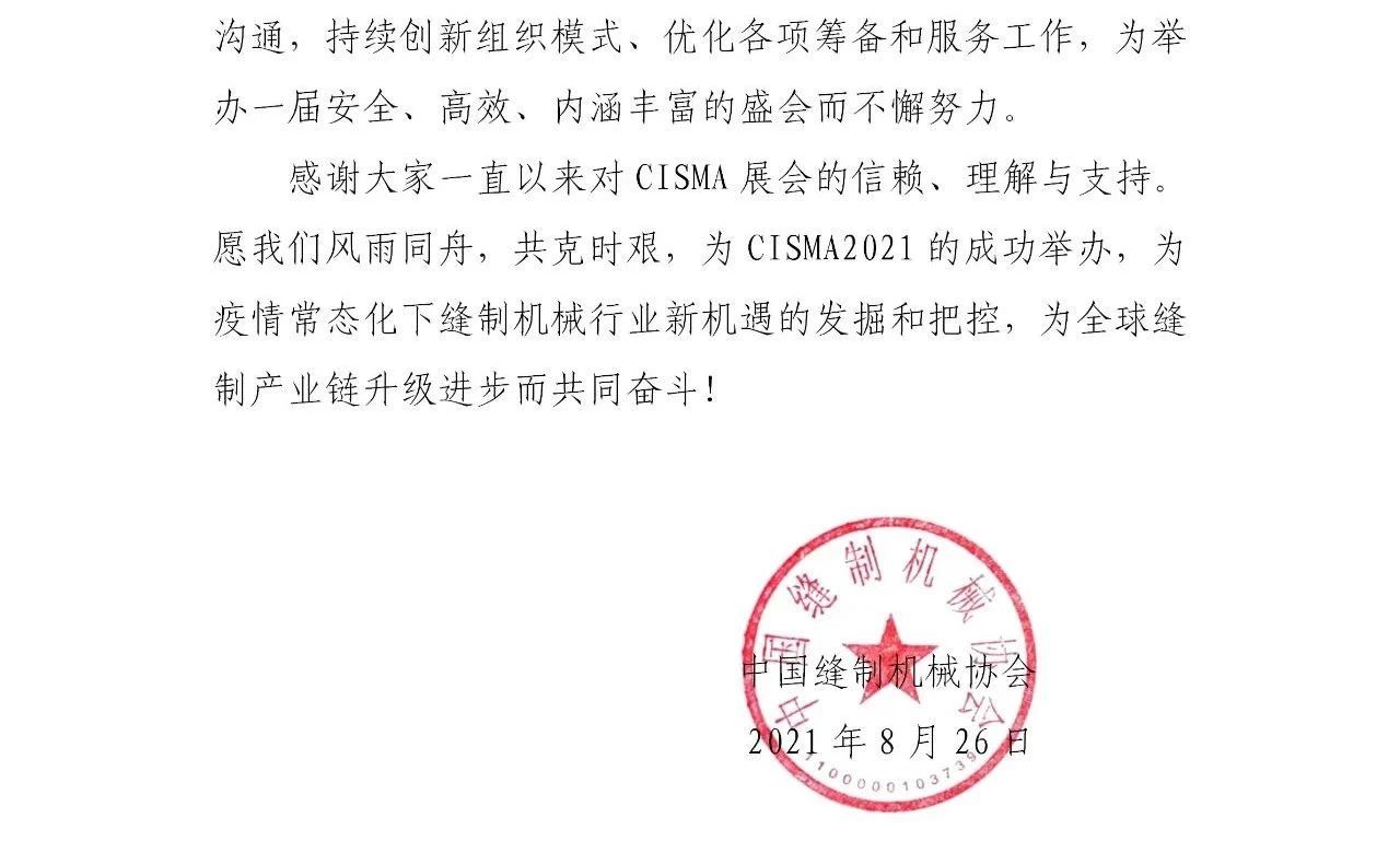 接主辦方通知,原定于2021年9月26-29日舉辦的“2021中國(guó)國(guó)際縫制設(shè)備展覽會(huì)(CISMA2021)”開展時(shí)間延期至2022年1月7-10日舉辦。