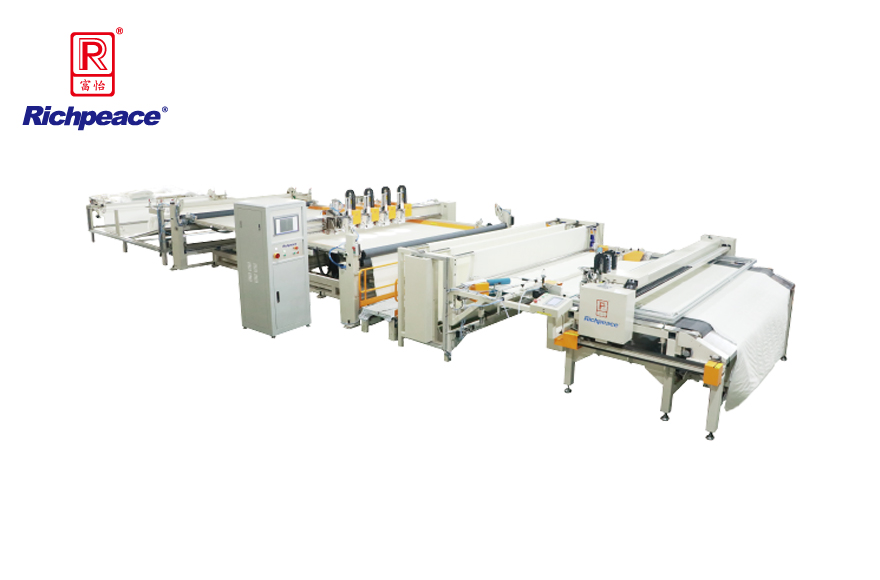 2、底布、面布、噴膠棉主動(dòng)送料,中間花型絎縫,自動(dòng)裁剪切四邊和四角缺口,全自動(dòng)流水化作業(yè)。